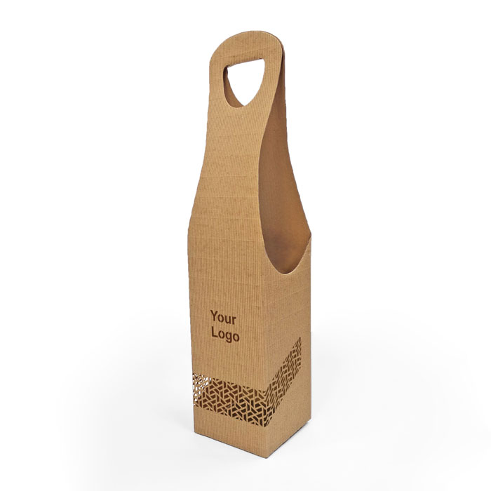 Nowoczesne opakowanie na wino z geometrycznym wzorem wyciętym laserowo u podstawy. Wykonane z naturalnej tektury falistej, zachwyca prostotą i surowym designem, który podkreśla ekologiczny charakter prezentu. Idealne jako eleganckie opakowanie firmowe - z opcją dodania logotypu.