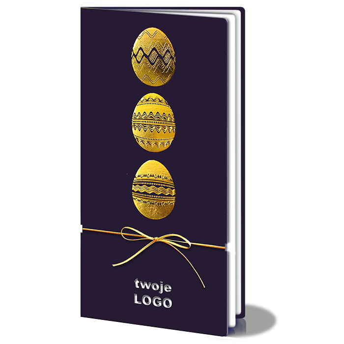Efektowna kartka wielkanocna o wyrazistym, eleganckim charakterze, w której głęboki granat spotyka się z intensywnym blaskiem złota. Smukła, pionowa kompozycja okładki została ozdobiona trzema tłoczonymi pisankami wykonanymi techniką złocenia, które przyciągają uwagę precyzją detalu i dekoracyjnym rytmem wzoru. Całość dopełnia delikatny, złoty sznurek przewiązany w subtelną kokardę, nadający kartce luksusowego, ręcznie wykończonego charakteru. To projekt, który łączy klasyczną elegancję z nowoczesną formą i doskonale sprawdzi się jako wyjątkowa oprawa wielkanocnych życzeń.