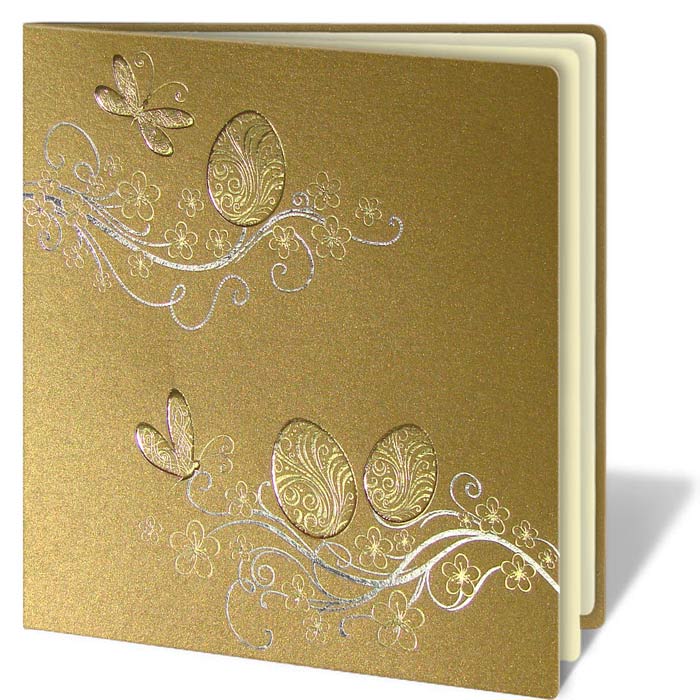 Okładka została wykonana z metalizowanego papieru o szlachetnym połysku, który pięknie odbija światło i nadaje kartce wyjątkowej elegancji. Powierzchnię zdobią ornamenty wykonane metodą hot print w kolorze złotym i srebrnym, uzupełnione delikatnym tłoczeniem wybranych elementów, co nadaje całości efekt głębi i wyrafinowania. Motyw pisanek i roślinnych linii tworzy harmonijną, spokojną kompozycję. Wnętrze kartki stanowi matowa wkładka w kolorze ecru, będąca jasnym i czytelnym tłem dla wielkanocnych życzeń.
