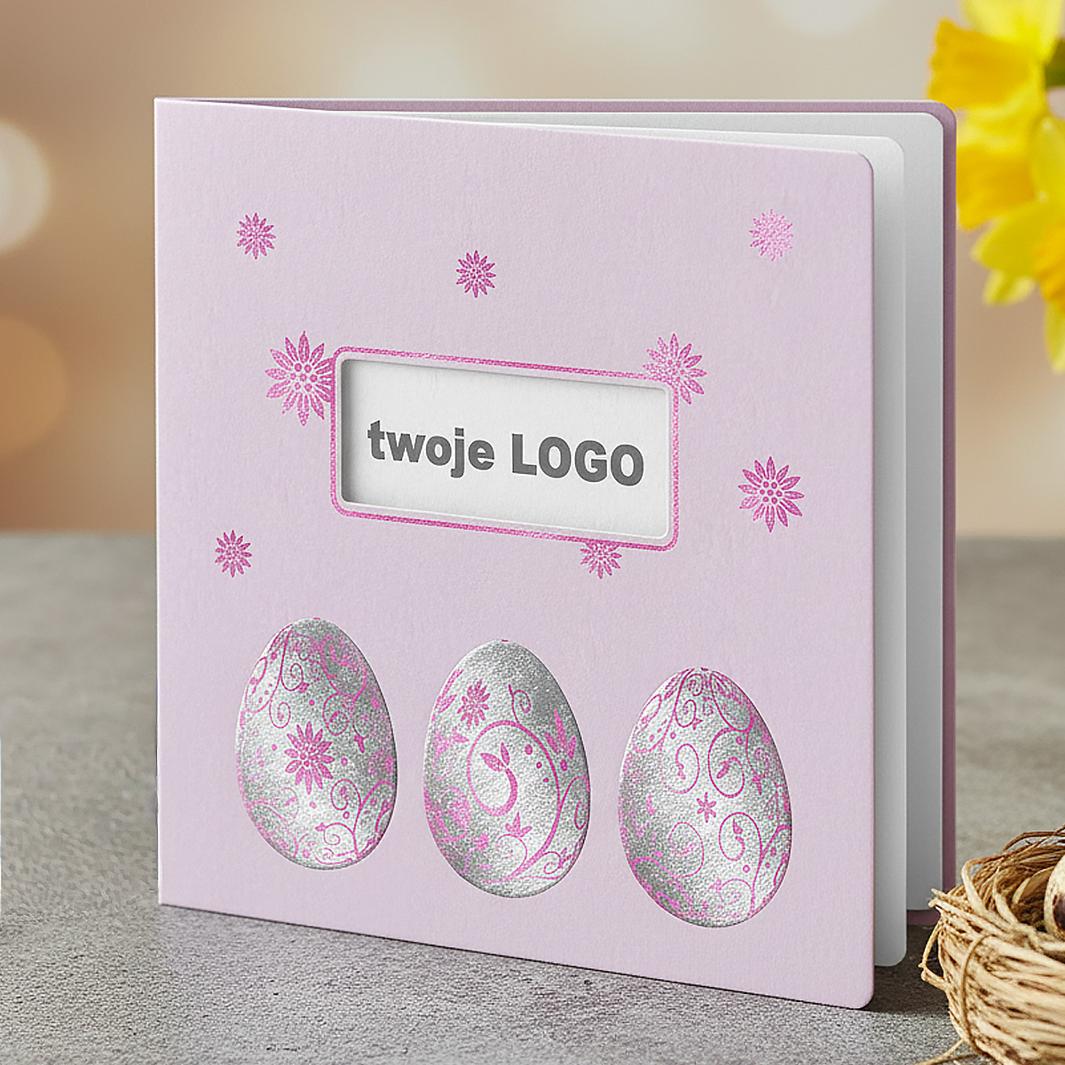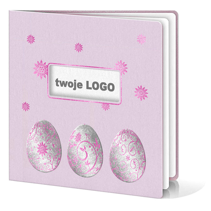 Okładka została wykonana z metalizowanego papieru w kolorze delikatnego fioletu, który nadaje kartce nowoczesny, a jednocześnie ciepły charakter. Dolną część okładki zdobią trzy pisanki wysrebrzone i wytłoczone, ozdobione finezyjnymi motywami gałązek i kwiatów wykonanych metodą hot print w kolorze fioletowym. Nad pisankami umieszczono laserowo wycięte okienko, przez które widoczne jest logo nadrukowane na pierwszej stronie wkładki. Całość dopełnia elegancka ramka wokół okienka oraz drobne kwiatowe akcenty, również wykonane fioletową folią, podkreślające spójność i precyzję projektu.