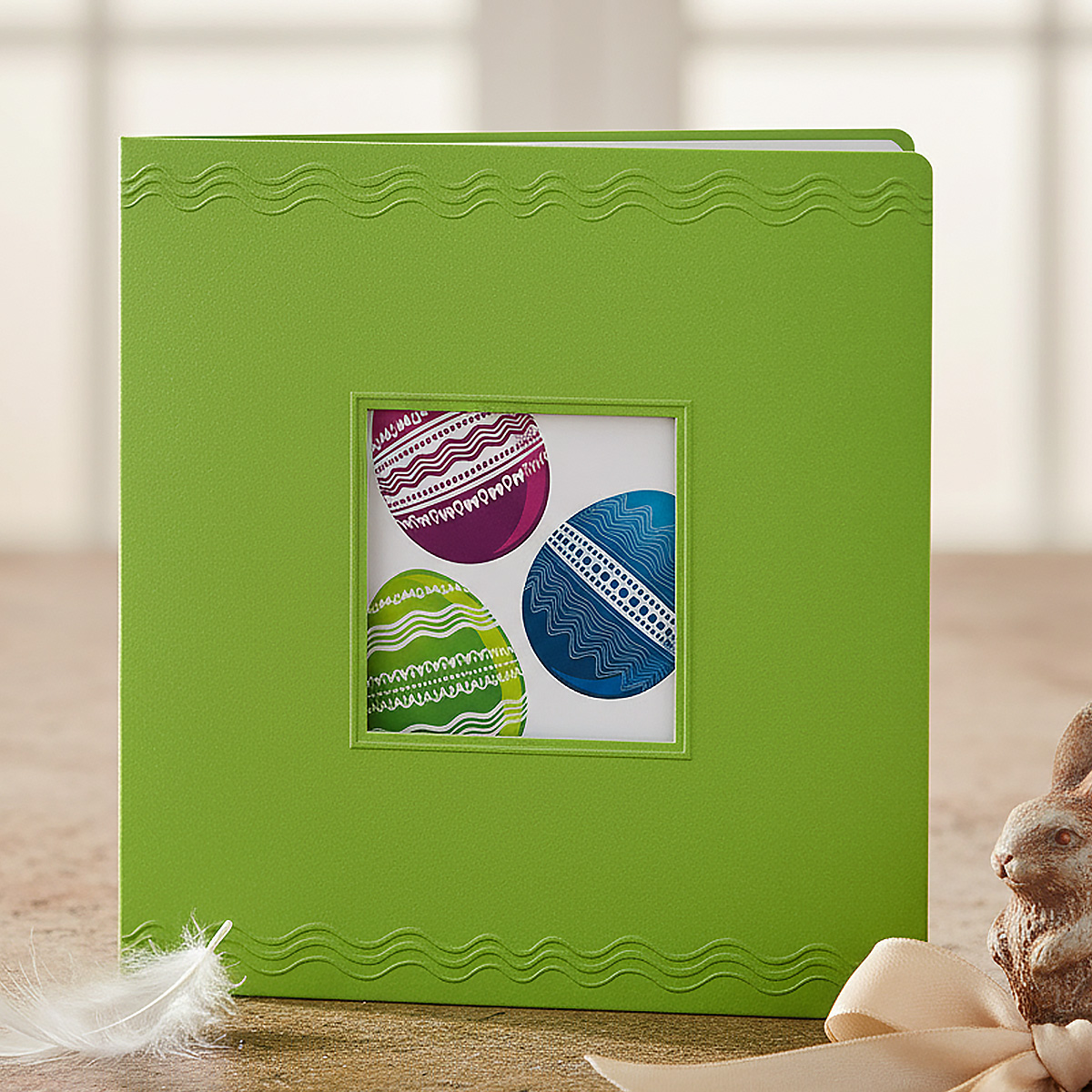Elegancka kartka wielkanocna o lekkim, wiosennym charakterze, łącząca opalizującą zieleń z barwnym motywem pisanek widocznym przez centralne okienko. Projekt wyróżnia się subtelnym połyskiem papieru, precyzyjnym wycięciem laserowym oraz dekoracyjnymi tłoczeniami, które nadają całości delikatny, a jednocześnie dopracowany wizualnie wygląd.