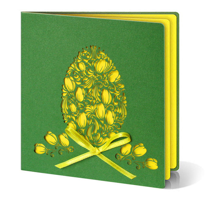 Okładkę wykonano z matowego papieru w kolorze ciemnej zieleni. Centralnym elementem jest misternie wycięta laserowo pisanka, przez którą widoczna jest intensywnie żółta wkładka, nadająca całości wyrazistego kontrastu i efektu głębi. Kompozycję uzupełnia delikatna, satynowa wstążka w żółtym kolorze, przewiązana na froncie kartki, która dodaje jej uroku i dekoracyjnego charakteru. Wnętrze kartki stanowi matowa wkładka w kolorze żółtym, przeznaczona do nadruku treści życzeń.