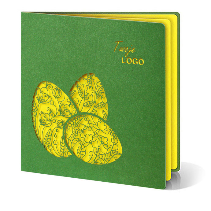 Elegancka kartka wielkanocna, która przyciąga uwagę wyrazistym kontrastem kolorów i dekoracyjną formą. Ciemnozielona, matowa okładka tworzy spokojne, szlachetne tło dla trzech misternie wyciętych laserowo pisanek, przez które subtelnie przebija intensywna, żółta wkładka. Ten zabieg nadaje projektowi lekkości, głębi i nowoczesnego charakteru, jednocześnie mocno nawiązując do wiosennej symboliki Wielkanocy.