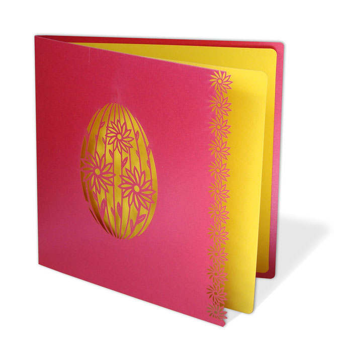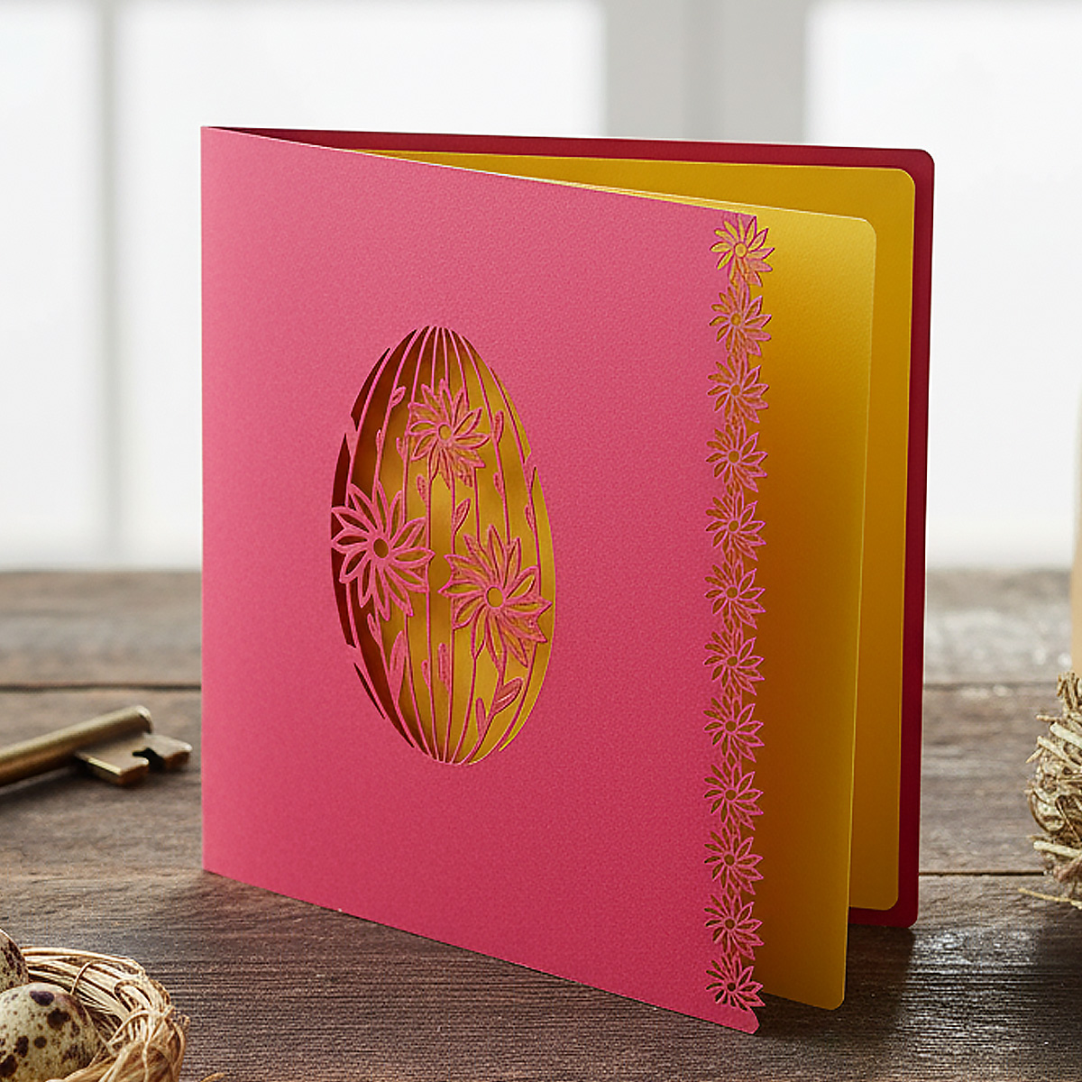 Okładka została wykonana z perłowego papieru w kolorze różowym, delikatnie odbijającego światło i nadającego kartce szlachetny charakter. Centralnym motywem jest pisanka wielkanocna wycięta laserowo, której ażurowa forma pozwala subtelnie wyeksponować kolor wkładki. Prawy brzeg okładki zdobi pionowy pas drobnych, laserowo wycinanych kwiatków, który nadaje całości lekkości i dekoracyjnego rytmu, przywodząc na myśl pierwsze wiosenne dni.