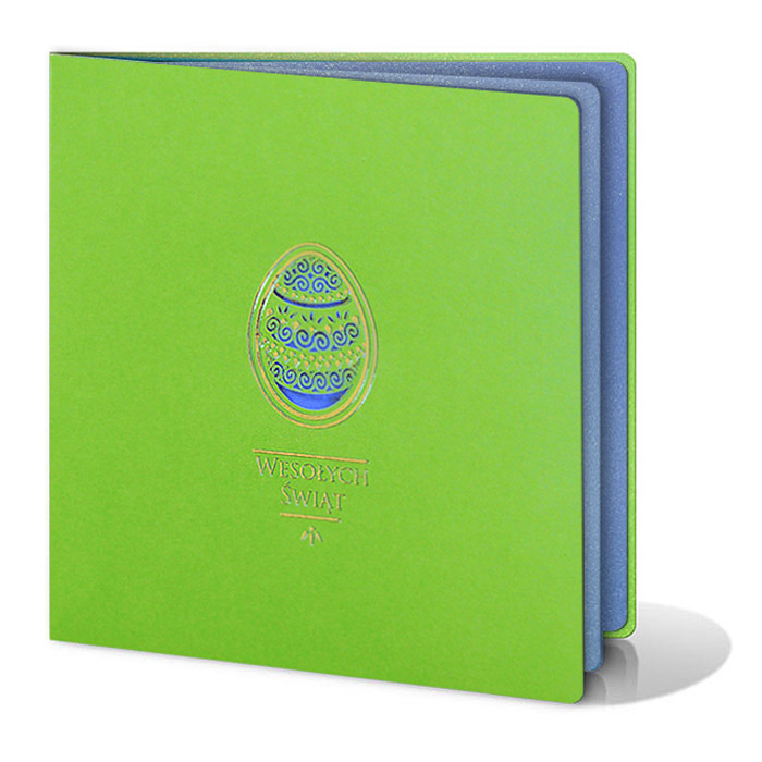 Wnętrze kartki uzupełnia metalizowana wkładka w kolorze niebieskim, przeznaczona do nadruku życzeń. Kontrast pomiędzy jasną zielenią okładki a chłodnym odcieniem wkładki nadaje projektowi nowoczesny i wyrazisty charakter, a jednocześnie zapewnia dobrą czytelność tekstu. Kartka została wykonana z dużą starannością, z dbałością o precyzję cięcia, jakość złocenia oraz estetyczne wykończenie każdego detalu.