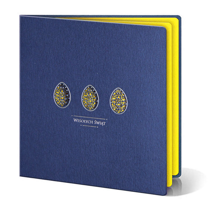 Okładka została wykonana z wysokiej jakości metalizowanego papieru w kolorze granatowym, który nadaje kartce prestiżowy i nowoczesny wygląd. W centralnej części umieszczono trzy pisanki wycinane laserowo i pokryte srebrną folią, tworzące efektowną, a jednocześnie uporządkowaną kompozycję. Poniżej znajduje się napis "Wesołych Świąt", również wykonany srebrną folią, co zapewnia spójność stylistyczną i elegancki blask całego projektu.