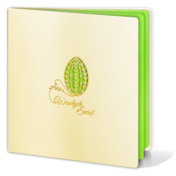 Okładka została wykonana z perłowego papieru w kolorze ecru, który miękko odbija światło i nadaje kartce szlachetny charakter. W centrum umieszczono laserowo wycinaną pisankę, dodatkowo pokrytą złotą folią, podkreślającą jej dekoracyjny wzór. Złocony napis "Wesołych Świąt" subtelnie dopełnia całość. Wnętrze kartki uzupełnia matowa wkładka w świeżym, zielonym kolorze, kojarzącym się z wiosną i nowym początkiem.