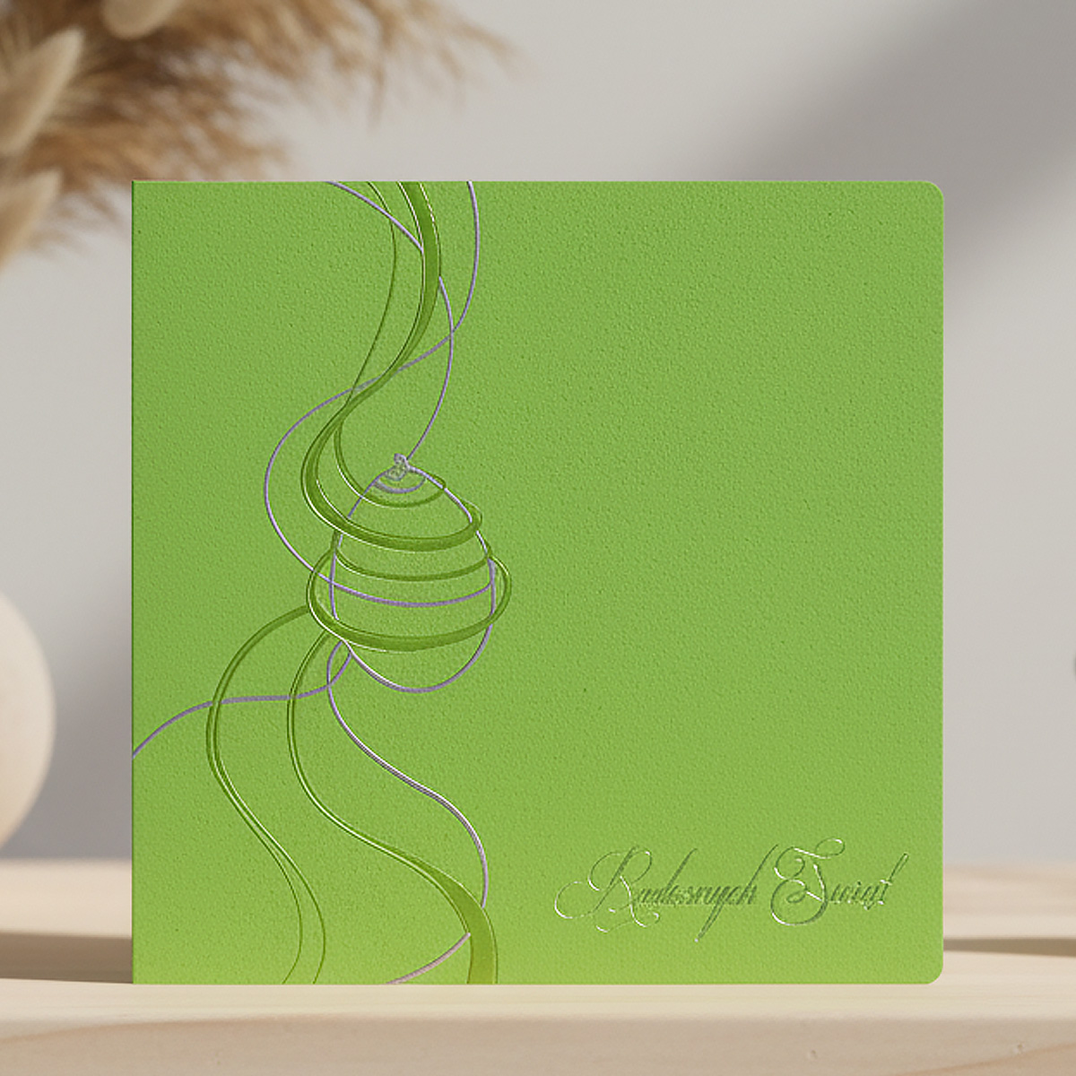 Elegancka kartka wielkanocna o świeżej, nowoczesnej stylistyce, utrzymana w intensywnym odcieniu zieleni z delikatnym metalicznym połyskiem. Projekt łączy subtelność świątecznej symboliki z dopracowanymi zdobieniami, tworząc spójną i estetyczną formę idealną do biznesowych życzeń wielkanocnych.
