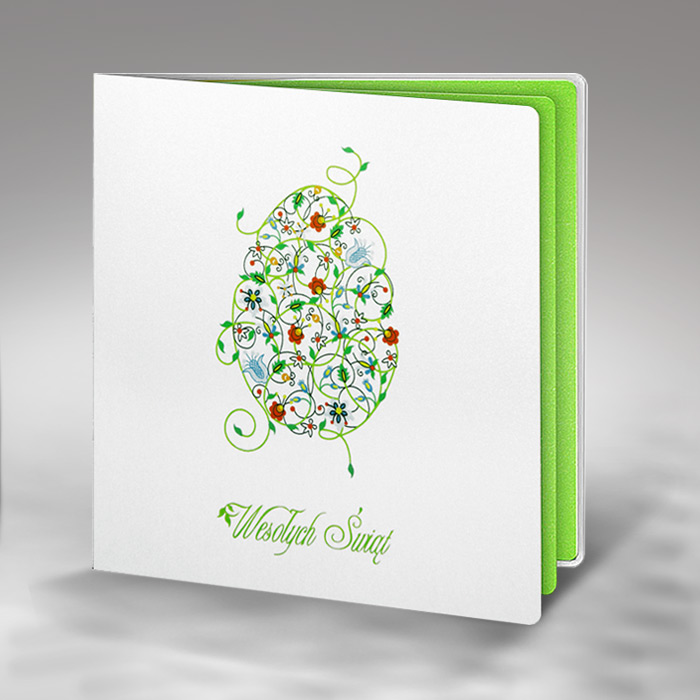 Wnętrze kartki zaskakuje energetycznym, zielonym kolorem matowej wkładki, który podkreśla ludowy charakter projektu i przywołuje skojarzenia z budzącą się do życia przyrodą. To propozycja idealna dla osób i firm, które chcą przekazać świąteczne życzenia w nieco bardziej oryginalnej, regionalnej formie, zachowując jednocześnie elegancki styl.