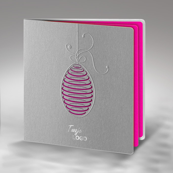 Okładka została wykonana z wysokiej jakości metalizowanego papieru w kolorze srebrnym. W centralnej części znajduje się pisanka wycinana laserowo, dodatkowo wytłoczona, co nadaje kompozycji głębi i eleganckiej trójwymiarowości. Przez wycięcie widoczna jest matowa wkładka w intensywnym różowym kolorze, która ożywia całość i nadaje projektowi nowoczesnego charakteru.