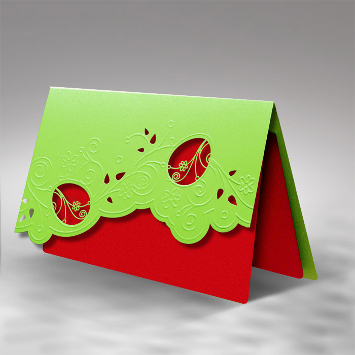Okładka została wykonana z metalizowanego papieru w jasnym, świeżym odcieniu zieleni. Jej dolna krawędź została ozdobiona dekoracyjnym, falowanym wycięciem laserowym z motywami roślinnymi i dwoma pisankami. Całość uzupełniają subtelne tłoczenia, które nadają projektowi lekkości i elegancji. Przez ażurowe wycięcia widoczna jest metalizowana wkładka w intensywnym czerwonym kolorze, tworząca efektowny kontrast i podkreślająca świąteczny charakter kartki.