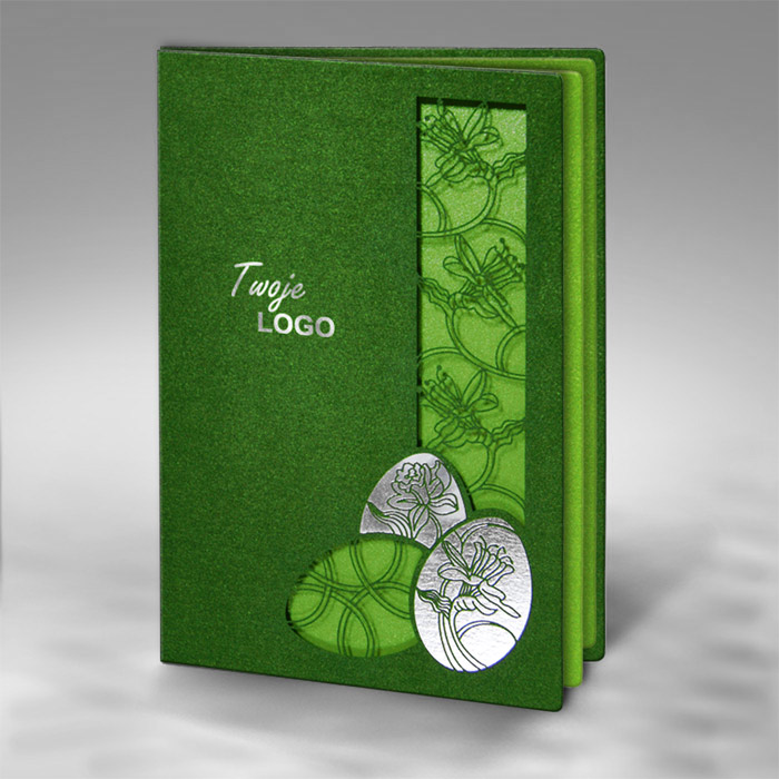 Okładka została wykonana z wysokiej jakości matowego papieru barwionego w masie w intensywnym zielonym kolorze. Jej dolną część zdobią trzy pisanki - dwie wykonane techniką hot print srebrną folią oraz jedna wycięta laserowo, co nadaje całości subtelny efekt głębi. Prawą stronę kartki uzupełnia pionowy, laserowo wycięty motyw kwiatowy, przez który widoczna jest jasnozielona, metalizowana wkładka z delikatnym roślinnym wzorem. Całość prezentuje się lekko, elegancko i bardzo nowocześnie.