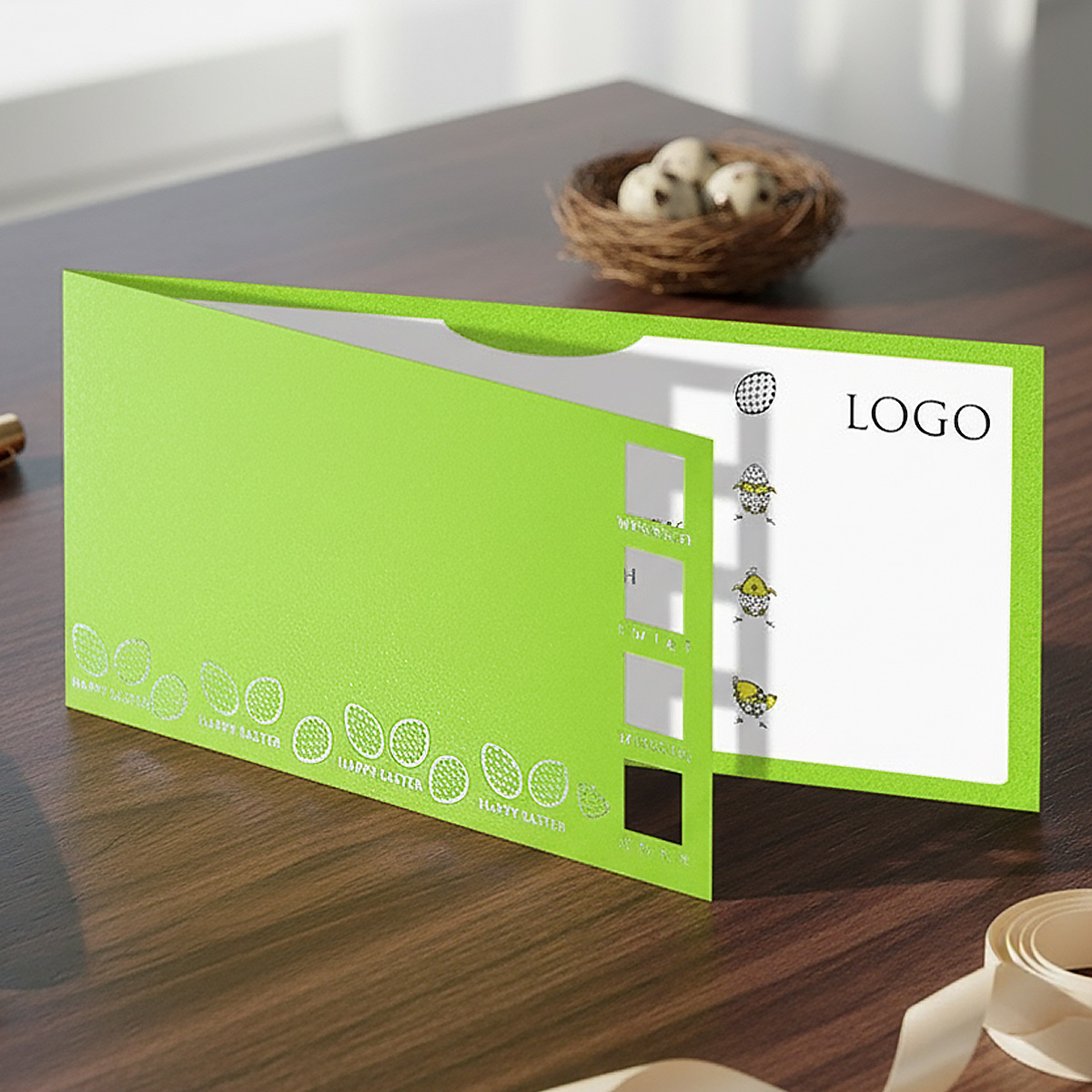 Okładka została wykonana z metalizowanego papieru w kolorze zielonym, który subtelnie odbija światło i nadaje kartce nowoczesnego charakteru. Charakterystycznym elementem projektu jest krótszy przód okładki, odsłaniający fragment wnętrza i budujący ciekawy efekt warstwowości. Front zdobią motywy pisanek oraz napisy wykonane metodą srebrzenia, rozmieszczone w rytmicznej, dekoracyjnej kompozycji, która podkreśla świąteczny, a jednocześnie nowoczesny styl kartki.