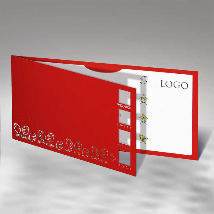 Okładka została wykonana z wysokiej jakości matowego papieru o gumowej strukturze w kolorze czerwonym, przyjemnego w dotyku i trwałego. Jej charakterystycznym elementem jest krótszy przód, który odsłania fragment wnętrza kartki i nadaje całości nowoczesnego, designerskiego wyglądu. Dolną część okładki zdobią stylizowane pisanki oraz napisy wykonane metodą srebrzenia, subtelnie odbijające światło i podkreślające świąteczny charakter kartki.