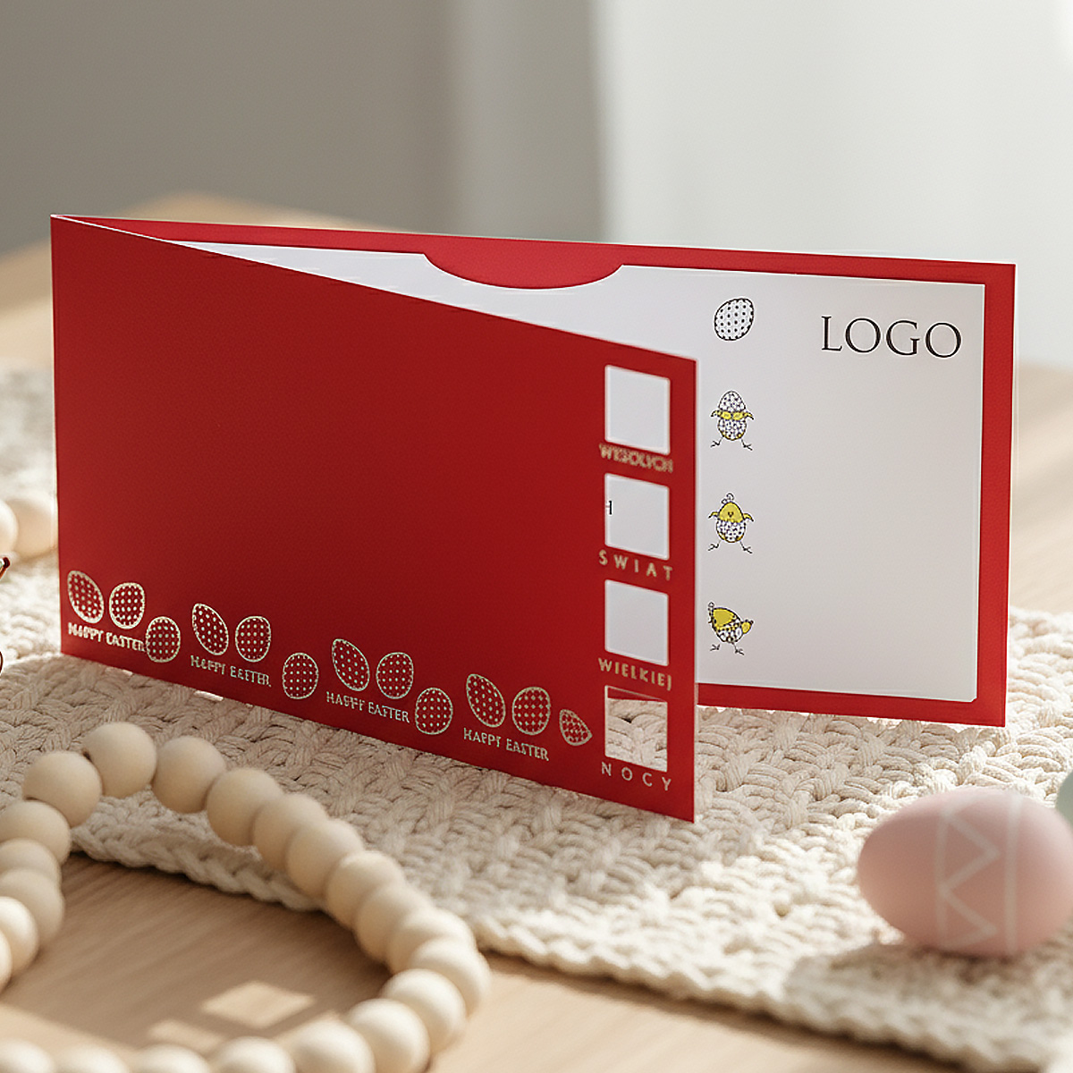 Kartka, która wyróżnia się nietypową konstrukcją i eleganckim minimalizmem, nadając wielkanocnym życzeniom nowoczesną i profesjonalną oprawę.