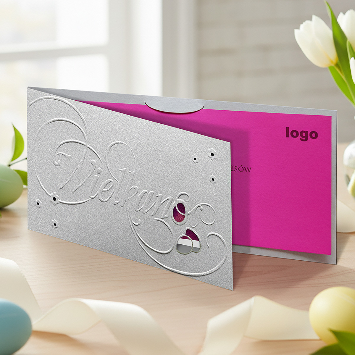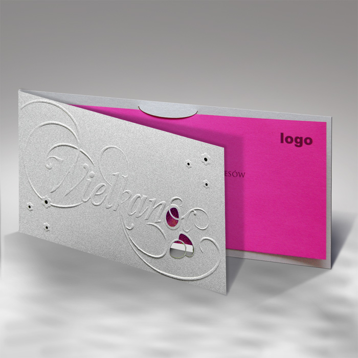 Nowoczesna i subtelnie romantyczna kartka wielkanocna, która łączy chłodną elegancję srebra z ciepłym akcentem intensywnego różu. Harmonijne zestawienie faktur, tłoczeń i wycięć laserowych tworzy wyrafinowaną oprawę świątecznych życzeń o świeżym, wiosennym charakterze.
