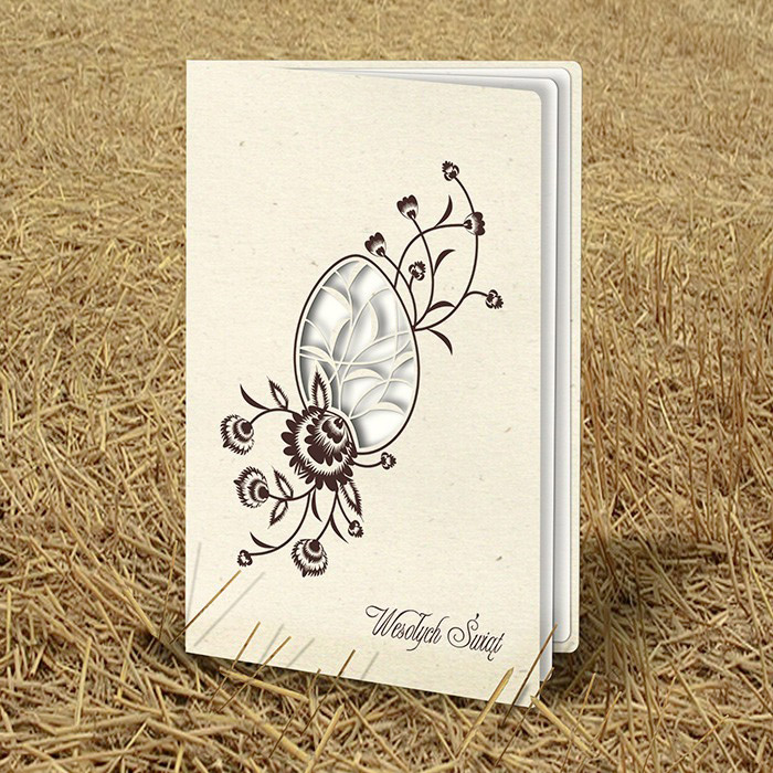 Okładka została wykonana z ekologicznego papieru w kolorze ecru o delikatnej strukturze. W centralnej części znajduje się laserowo wycinana pisanka, dodatkowo uszlachetniona brązową folią, która podkreśla jej kształt i nadaje całości elegancki charakter. Taką samą folią wykonano napis "Wesołych Świąt", harmonijnie dopełniający kompozycję. Wnętrze kartki uzupełnia matowa wkładka w kolorze ecru, stanowiąca estetyczne tło dla nadruku życzeń.