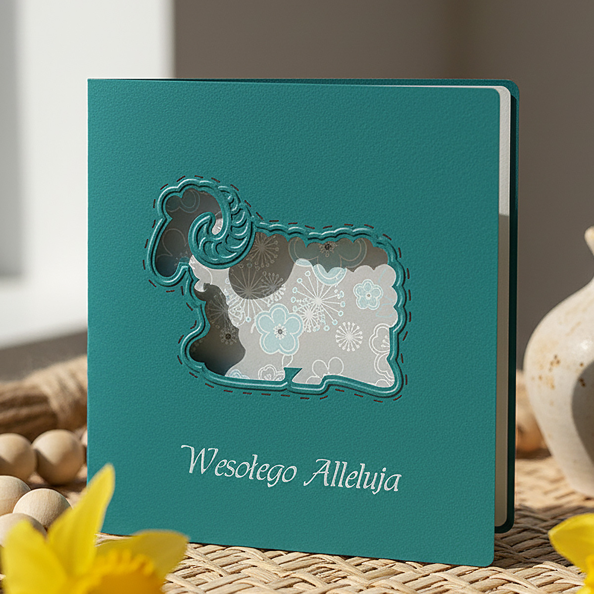 Okładka została wykonana z matowego papieru w kolorze ciemnego turkusu, który nadaje kartce szlachetną, stonowaną formę. Centralnym elementem projektu jest baranek wycięty laserowo, z dodatkowo wytłoczonym konturem, podkreślającym precyzję i głębię kompozycji. Wielowarstwowe wycięcie nadaje kartce efekt przestrzenności i subtelnej lekkości. U dołu okładki umieszczono napis "Wesołego Alleluja", wykonany błyszczącą turkusową folią, który delikatnie ożywia całość i wprowadza świąteczny akcent.