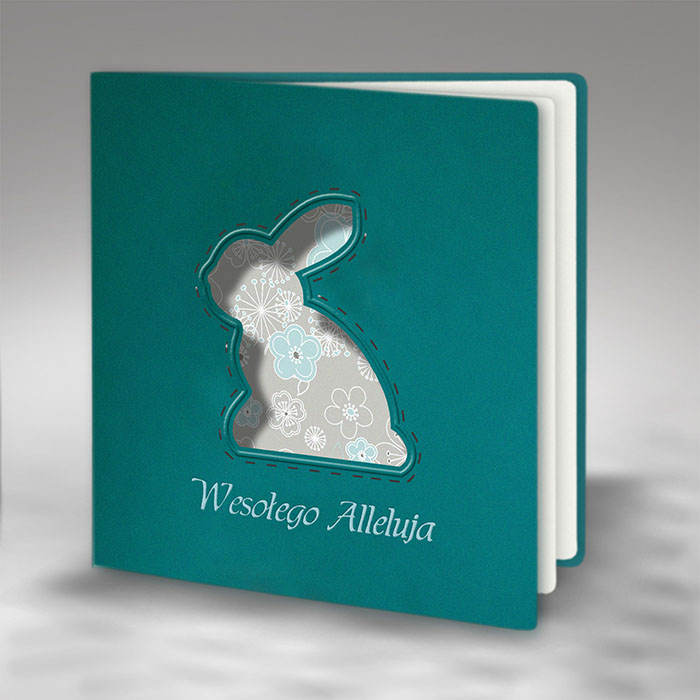 Okładka została wykonana z matowego papieru w kolorze ciemnego turkusu. Centralnym motywem jest zajączek wycięty laserowo, którego kontur dodatkowo podkreślono subtelnym tłoczeniem oraz precyzyjnym, podwójnym cięciem laserowym. Całość dopełnia napis "Wesołego Alleluja" wykonany błyszczącą turkusową folią, który elegancko kontrastuje z matową powierzchnią papieru.