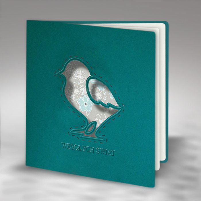 Okładka została wykonana z matowego papieru w kolorze ciemnego turkusu. Centralnym elementem jest kurczaczek wycięty laserowo, którego kontur został dodatkowo wytłoczony i podkreślony precyzyjnym cięciem laserowym. Pod motywem znajduje się tłoczony napis "Wesołych Świąt", harmonijnie wpisujący się w całość projektu.