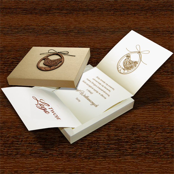 Elegancka i ekologiczna kartka wielkanocna w oryginalnej formie pudełka, łącząca funkcję kartki świątecznej oraz opakowania na drobne upominki lub słodycze.