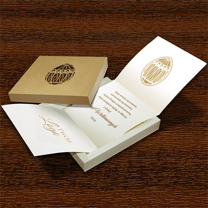 Elegancka wielkanocna kartka w formie zamykanego pudełka.To propozycja dla firm i instytucji, które chcą przekazać świąteczne życzenia w formie trwałej, estetycznej i zdecydowanie bardziej reprezentacyjnej niż standardowa kartka.