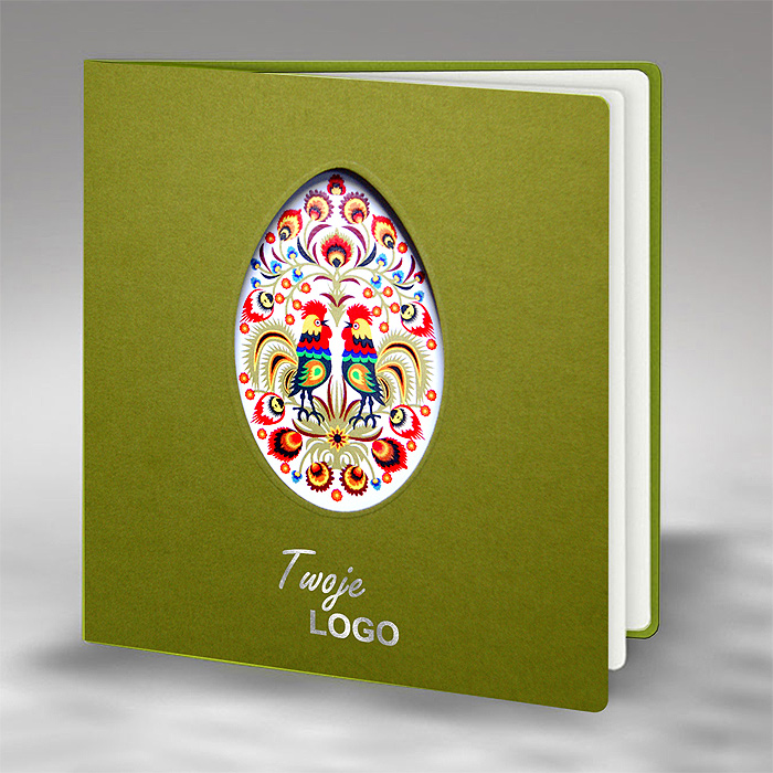 W centralnej części okładki znajduje się precyzyjnie wycięte laserowo jajko, przez które widoczny jest nadrukowany na wkładce kolorowy motyw kurpiowski. Bogactwo barw i symetryczna kompozycja wzoru pięknie kontrastują z jednolitą, oliwkową okładką. Całość dopełnia subtelne tłoczenie wykonane wokół ramki, podkreślające staranność wykonania i dodające kartce eleganckiej głębi. Wkładka do nadruku wykonana jest z białego, matowego papieru, zapewniającego doskonałą czytelność życzeń.