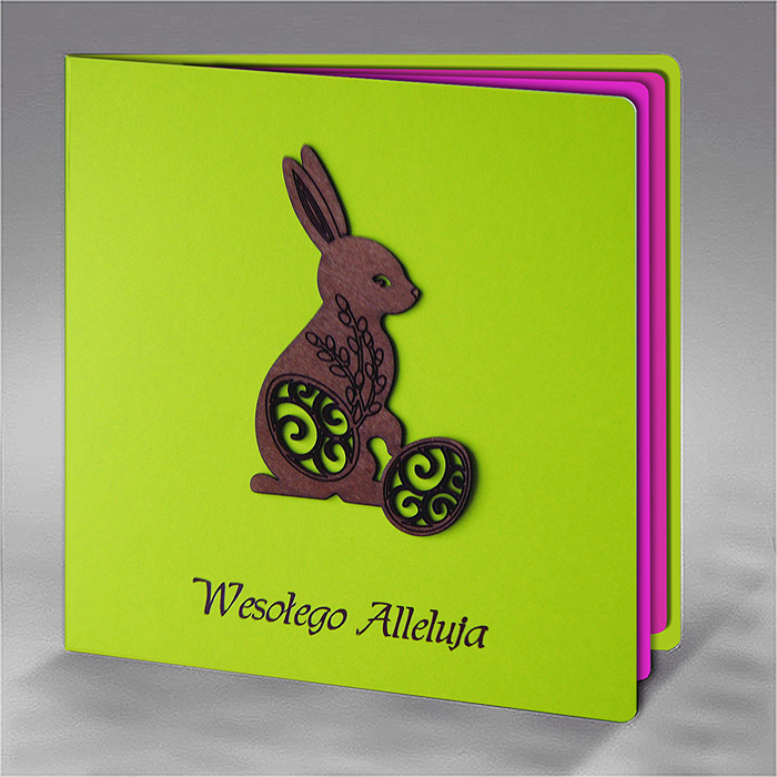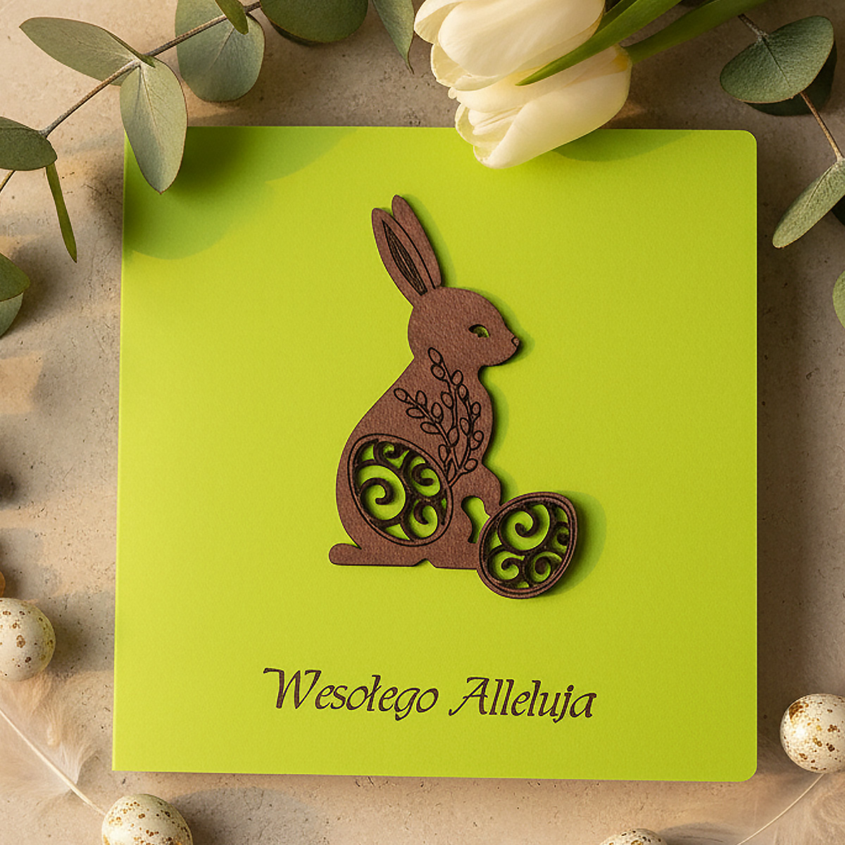 Centralnym elementem projektu jest drewniana aplikacja w kształcie zajączka. Jej ażurowe detale oraz naturalna faktura drewna tworzą ciekawy kontrast z gładką powierzchnią papieru i nadają kartce oryginalny, lekko rękodzielniczy charakter. Pod aplikacją umieszczono napis "Wesołego Alleluja", wykonany brązową folią, która subtelnie podkreśla świąteczny przekaz i harmonijnie współgra z kolorem drewnianego zdobienia.