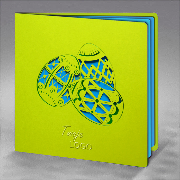 Na okładce znajdują się trzy pisanki wykonane techniką cięcia laserowego, uzupełnione hot-stampingiem w odcieniu zieleni. Połączenie ażurowych wycięć z delikatnym połyskiem folii tworzy efekt głębi i eleganckiej lekkości. Przez wycięcia widoczna jest wkładka do nadruku w intensywnym, niebieskim kolorze, która stanowi wyraziste tło dla pisanek i wzmacnia kontrast całej kompozycji.