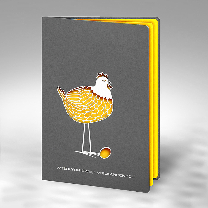 Okładka została wykonana z matowego papieru w kolorze szarym. Jej centralnym elementem jest stylizowana kura, wykonana techniką hot stampingu oraz precyzyjnego cięcia laserowego, co nadaje grafice elegancki połysk i subtelną głębię. Folia pięknie kontrastuje z neutralnym tłem, przyciągając wzrok i podkreślając świąteczny charakter kartki. Wnętrze uzupełnia intensywnie żółta wkładka, która dodaje kompozycji energii i wiosennej lekkości.