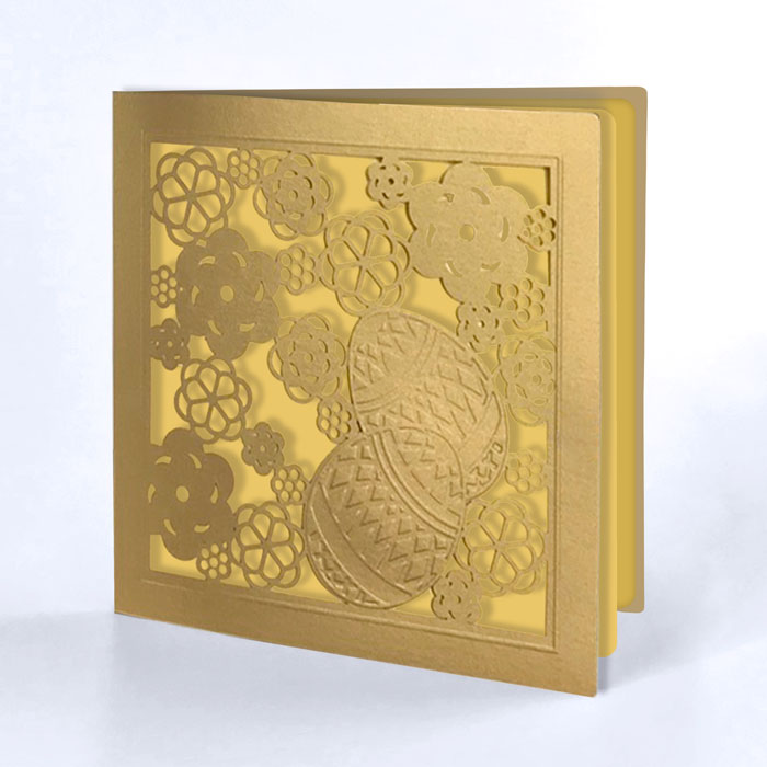 Okładka została wykonana z wysokiej jakości papieru w kolorze antycznego złota, który nadaje kartce szlachetny, ponadczasowy charakter. Jej powierzchnię zdobi precyzyjnie wykonany laserowy wzór kwiatowy, tworzący ażurową, dekoracyjną ramę. W centralnej części znajdują się dwa wytłoczone jajka z delikatnym ornamentem, subtelnie podkreślające wielkanocną symbolikę i nadające całości eleganckiej głębi. Wnętrze kartki uzupełnia złota wkładka, harmonijnie współgrająca z okładką i stanowiąca efektowne tło dla świątecznych życzeń.