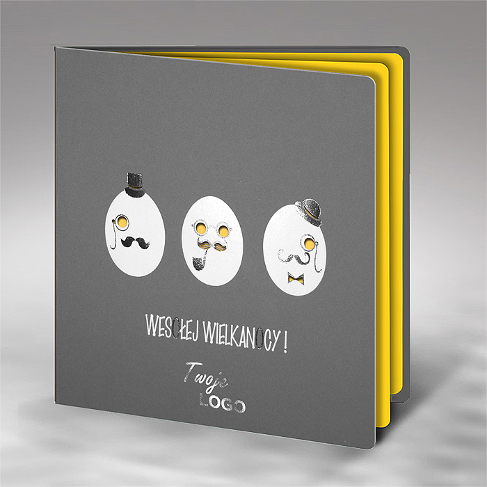 Okładka wykonana została z wysokiej jakości matowego papieru w kolorze szarym. Centralnym elementem są trzy stylizowane jajka, zdobione metodą hotstampingu w kolorze białym i czarnym. Drobne detale - takie jak oczy i elementy dekoracyjne - zostały precyzyjnie wycięte laserowo, co nadaje projektowi lekkości i charakteru. Wnętrze kartki uzupełnia intensywnie żółta, matowa wkładka, która wprowadza energetyczny kontrast i podkreśla radosny klimat całości.