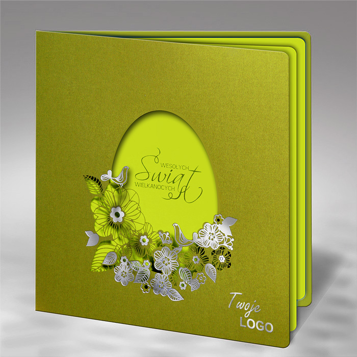 Kartka została wykonana z wysokiej jakości matowego papieru w kolorze oliwkowym. Okładkę zdobi misternie wykonane wycięcie laserowe w kształcie pisanki, wzbogacone srebrzonymi detalami, które delikatnie odbijają światło i dodają całości elegancji. Intensywnie zielona wkładka umieszczona pod okładką stanowi wyraziste tło dla ażurowego wzoru, podkreślając jego formę i głębię. Na pierwszej stronie wkładki znajduje się nadrukowany napis "Wesołych Świąt Wielkanocnych", który harmonijnie wpisuje się w całą kompozycję.