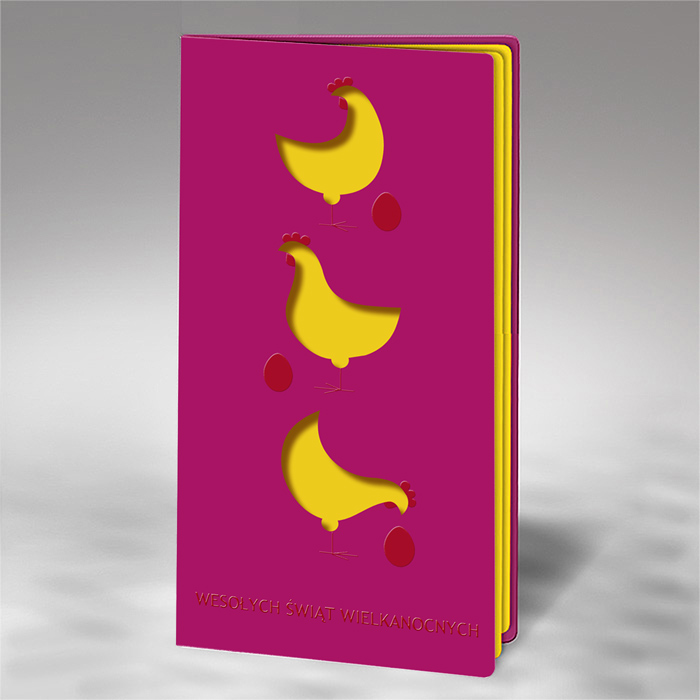 Okładka została wykonana z matowego papieru w kolorze różowym, stanowiącego wyraziste tło dla trzech zabawnych kur wyciętych laserowo. Dynamiczna kompozycja motywu nadaje kartce lekkości i rytmu, a całość uzupełniają drobne jajka oraz napis, pokryte lakierem punktowym, który subtelnie podkreśla wybrane elementy i dodaje im delikatnego połysku. Połączenie matowej powierzchni z błyszczącymi akcentami tworzy ciekawy, przyciągający wzrok kontrast.