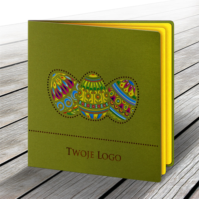 Okładkę zdobi motyw kolorowych pisanek wykonany innowacyjną techniką druku, przyciągającą uwagę intensywnością barw i precyzją detalu. Całość dopełniają delikatne kropeczki wycinane laserowo wokół nadruku, które wprowadzają lekkość i subtelny efekt dekoracyjny. Przez wycięcia widoczna jest matowa wkładka w kolorze żółtym, stanowiąca energetyczne, ciepłe tło dla kompozycji i wzmacniająca kontrast kolorystyczny.
