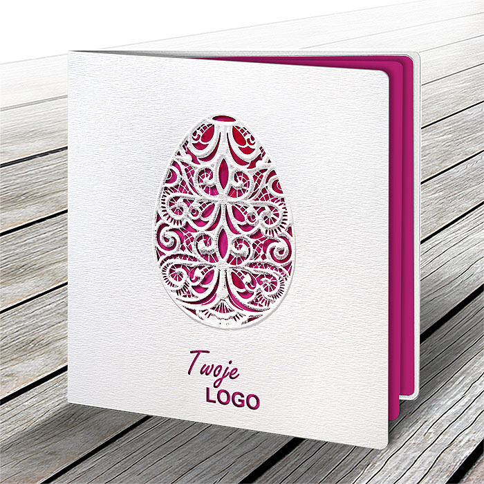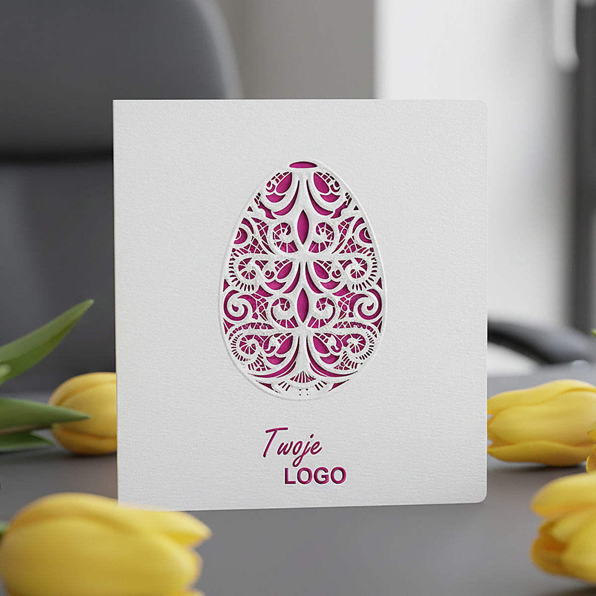 Centralnym elementem okładki jest misterny wzór pisanki wycięty laserowo i delikatnie tłoczony, który nadaje kartce lekkości oraz wyrafinowanej głębi. Przez ażurowe wycięcie widoczna jest wkładka do nadruku w matowym, różowym kolorze, wprowadzająca subtelny kontrast i miękki, wiosenny akcent. Całość zachwyca harmonią formy, koloru i precyzji wykonania.