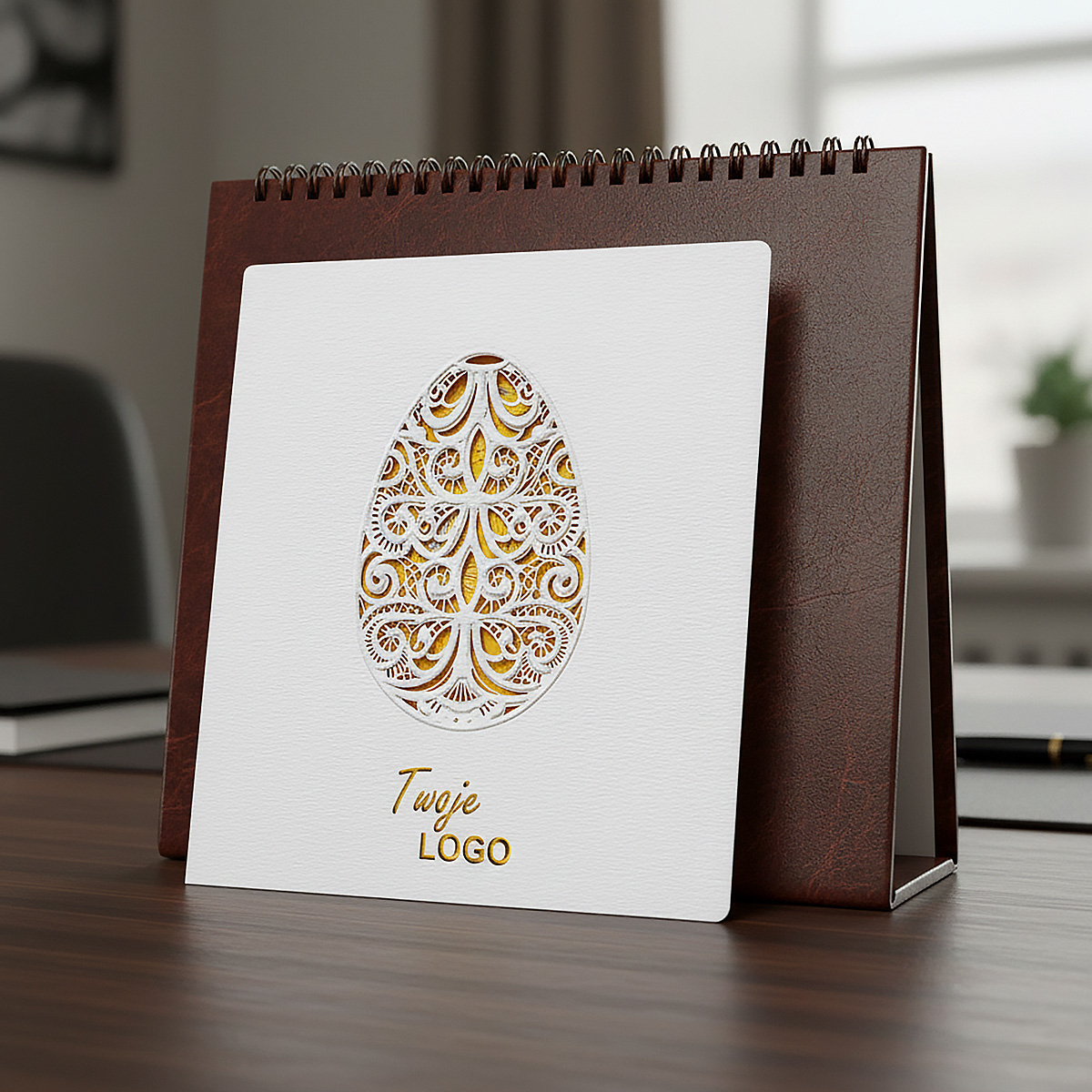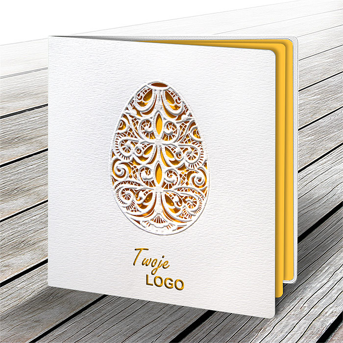 Centralnym elementem projektu jest misterny wzór pisanki wycięty laserowo i delikatnie tłoczony, który wprowadza subtelny efekt głębi i lekkości. Przez ażurowe wycięcie widoczna jest wkładka do nadruku w matowym, żółtym kolorze, dodająca kartce ciepłego, wiosennego akcentu i przyjemnego kontrastu z bielą okładki. Całość tworzy harmonijną, jasną kompozycję idealną na świąteczne życzenia.