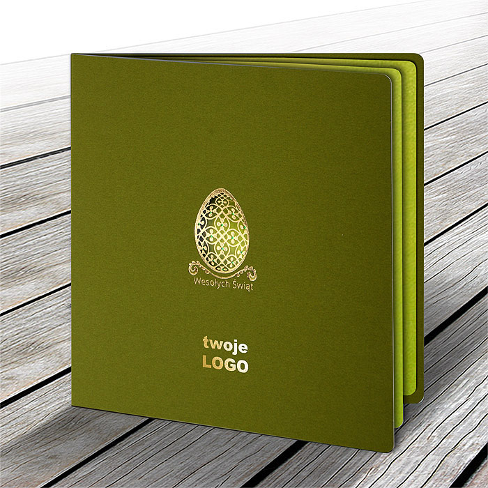 Centralnym elementem okładki jest motyw wielkanocnego jajka wykonany metodą hot-stampingu złotą folią. Delikatne, drobne elementy zostały dodatkowo pokryte zieloną, połyskliwą folią, co tworzy subtelny efekt gry światła i elegancki kontrast. Przez ażurowe wycięcie widoczna jest matowa wkładka do nadruku w kolorze soczystej zieleni, która wzmacnia wrażenie głębi i spójności całego projektu.