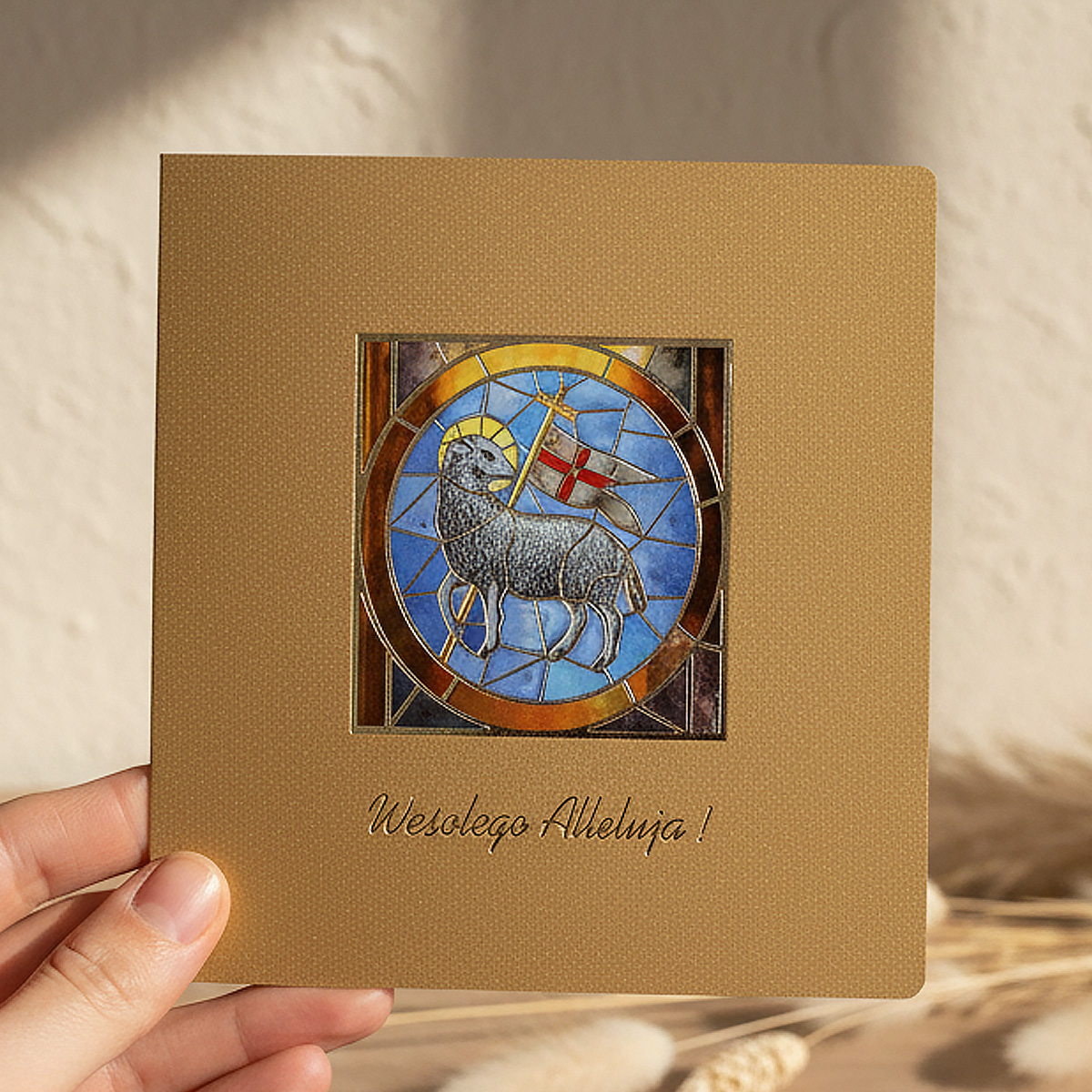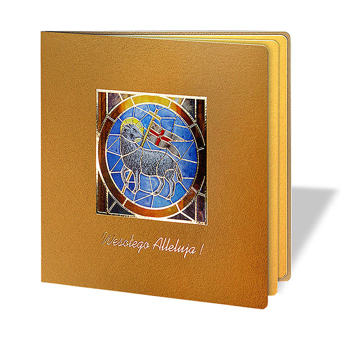 Okładkę zdobi kolorowy religijny motyw w stylu witrażu, przedstawiający Baranka Wielkanocnego z chorągwią, wykonany innowacyjną techniką druku oraz hot-stampingu w kolorze złotym. Subtelny połysk złocenia pięknie współgra z intensywnymi barwami grafiki, nadając całości głębi i elegancji. Pod motywem umieszczono napis "Wesołego Alleluja!", który dopełnia świąteczny charakter kartki. Wnętrze uzupełnia metalizowana wkładka w odcieniu żółto-złotym, przeznaczona do nadruku życzeń oraz logotypu.