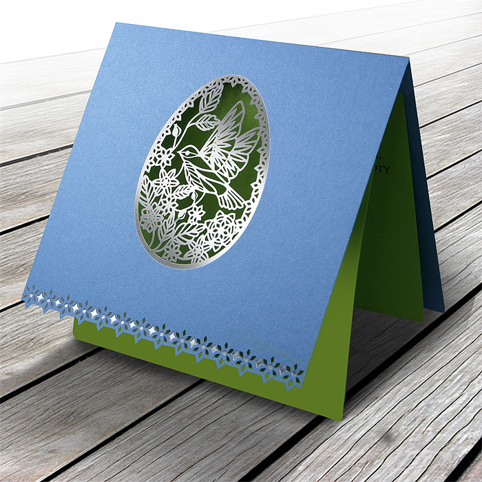 Okładka została wykonana z wysokiej jakości metalizowanego papieru w kolorze niebieskim, subtelnie połyskującego i podkreślającego elegancki charakter projektu. Centralnym elementem jest motyw wielkanocnego jajka, wykonany techniką hot stampingu w kolorze srebrnym oraz precyzyjnego cięcia laserowego. Ażurowy wzór, inspirowany naturą, nadaje kartce lekkości i wyjątkowej głębi, pozwalając światłu przenikać przez formę i budować efekt przestrzenności.