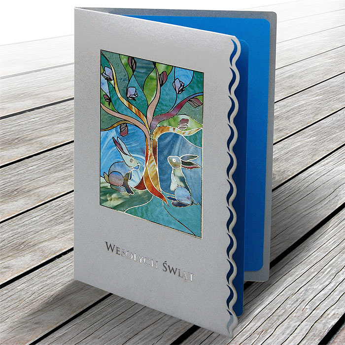 Artystyczna i pełna symboliki kartka wielkanocna, która zachwyca grą koloru, światła i precyzyjnego detalu. Połączenie chłodnego srebra z barwnym motywem witrażowym tworzy kompozycję o wyjątkowo spokojnym, a jednocześnie radosnym charakterze, idealnie oddającym atmosferę Wielkanocy.