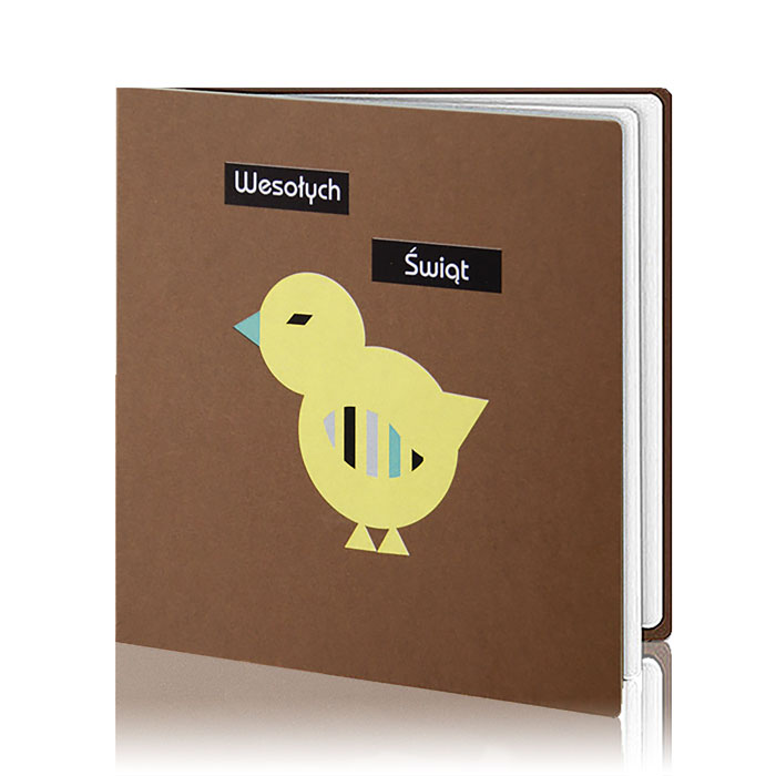 Na okładce znajduje się kolorowy, graficzny motyw kurczaczka o minimalistycznej formie, który w subtelny sposób nawiązuje do symboliki Wielkanocy. Całość dopełniają życzenia "Wesołych Świąt", umieszczone w formie nowoczesnych, kontrastujących elementów typograficznych. Kompozycja jest lekka, radosna i czytelna, a jednocześnie zachowuje elegancki umiar.