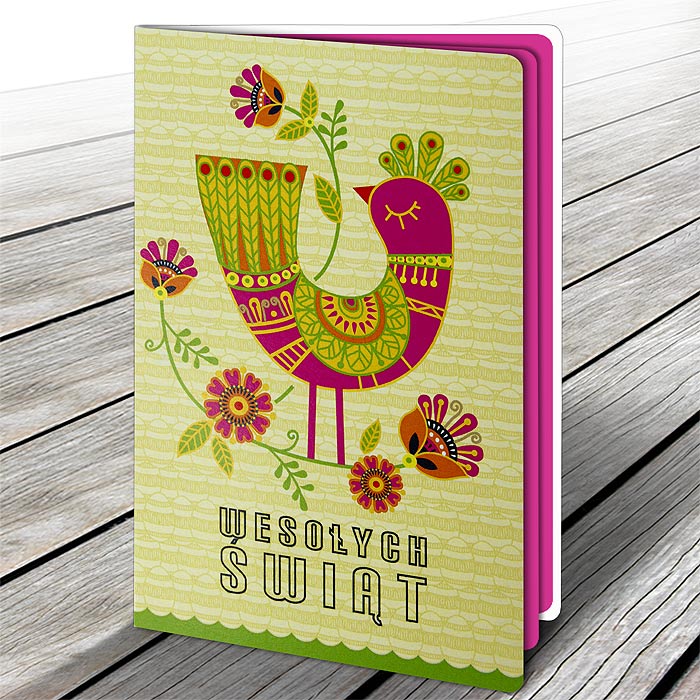 Okładka została wykonana z matowego papieru w kolorze białym, stanowiącego jasne tło dla drukowanego, barwnego motywu folkowego z ptakiem i kwiatami. Ornamentyka nawiązuje do tradycyjnych wzorów ludowych, tworząc kompozycję pełną energii i wiosennej świeżości. Całość dopełnia kontrastowa, różowa wkładka z matowego papieru, która dodaje kartce ciepła i nowoczesnego akcentu, a jednocześnie stanowi estetyczne tło dla życzeń.