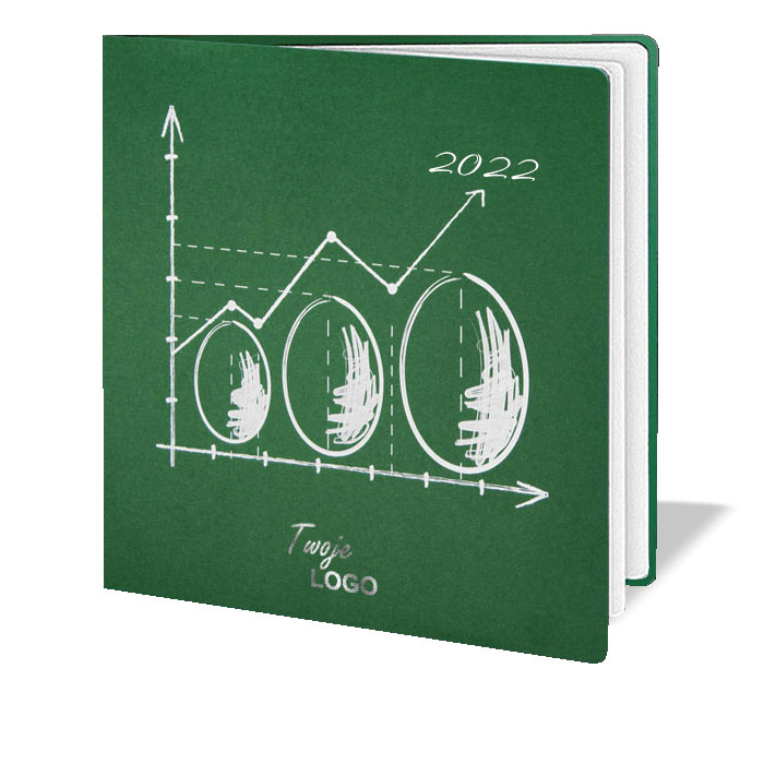 Okładka została wykonana z matowego papieru w głębokim, zielonym kolorze. Centralnym elementem jest biały, rysunkowy nadruk przedstawiający zabawny wykres, w którym świąteczne pisanki stają się częścią rosnącej krzywej - symbolu pozytywnych prognoz i dobrych życzeń na nadchodzący czas. Całość utrzymana jest w minimalistycznym stylu, który przyciąga uwagę i wywołuje uśmiech.