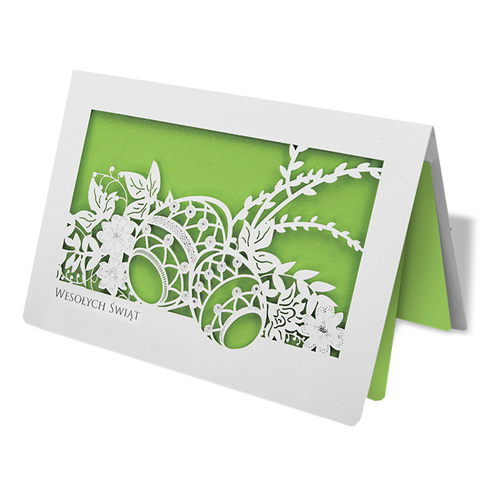 Kartka została wykonana z wysokiej jakości matowego papieru o delikatnej fakturze. Okładkę zdobi misterny, świąteczny motyw pisanek oraz roślinnych ornamentów, wycięty laserowo z dużą dokładnością i subtelnie podkreślony złoceniem. Ażurowa forma pozwala zajrzeć do wnętrza kartki, gdzie zielona wkładka stanowi harmonijne tło dla kompozycji i jednocześnie zapewnia doskonałą czytelność nadruku życzeń.