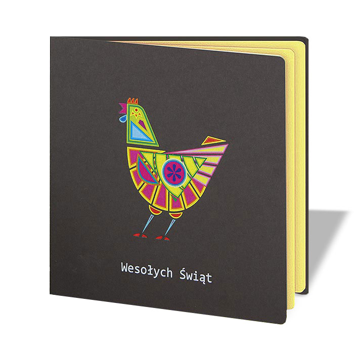 Okładkę zdobi kolorowy motyw kury, wykonany innowacyjną techniką druku. Geometryczna stylistyka oraz intensywne barwy tworzą nowoczesną interpretację wielkanocnego symbolu, łącząc humor, świeżość i design. Pod ilustracją umieszczono subtelny napis "Wesołych Świąt", który dopełnia kompozycję bez przytłaczania formy.
