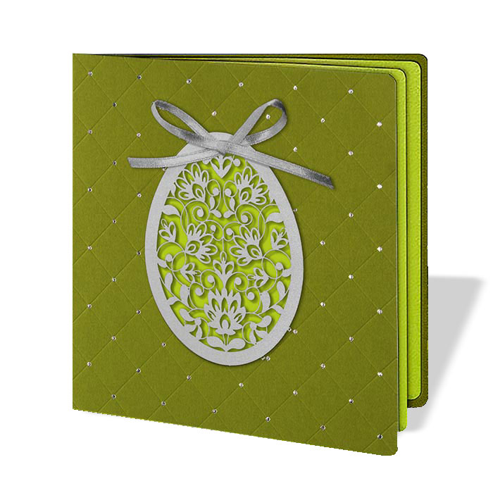 Okładkę zdobi tłoczona kratka uzupełniona drobnymi, srebrzonymi elementami, które subtelnie odbijają światło i dodają kartce głębi. Centralnym punktem projektu jest papierowa aplikacja w postaci ażurowego jajka z misternie wyciętym laserowo wielkanocnym motywem. Aplikacja została przymocowana satynową kokardką, co tworzy elegancki, trójwymiarowy efekt. Przez ażurowe wycięcie widoczna jest wkładka do nadruku w kolorze soczystej zieleni, która pięknie kontrastuje z oliwkową okładką i podkreśla dekoracyjny charakter kartki.