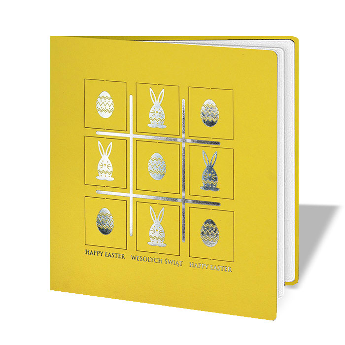 Okładkę zdobi motyw inspirowany popularną grą w "kółko i krzyżyk", w którym srebrzone elementy pisanek i zajączków zostały precyzyjnie wykonane oraz nacięte techniką laserową. Dzięki temu poszczególne elementy mogą być dowolnie przekręcane lub wyrywane, tworząc interaktywną, angażującą kompozycję. Całość zachwyca pomysłowością, precyzją wykonania i dopracowanym detalem. Wkładka do nadruku wykonana jest z białego, matowego papieru, idealnego do umieszczenia wielkanocnych życzeń.