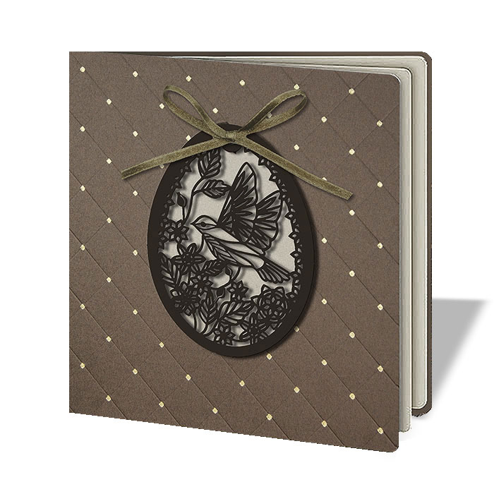 - Zdobienia: tłoczenie, złocone detale, aplikacja papierowa, wycięcie laserowe, satynowa kokardka