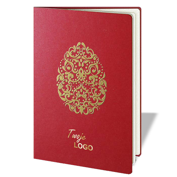 Okładka została wykonana z wysokiej jakości metalizowanego papieru w intensywnym czerwonym kolorze. Centralnym elementem kompozycji jest dekoracyjny motyw pisanki wykonany techniką termodruku w kolorze złotym, który subtelnie połyskuje i nadaje kartce prestiżowego charakteru. Poniżej umieszczono miejsce na logotyp, harmonijnie wpisujące się w całość projektu.